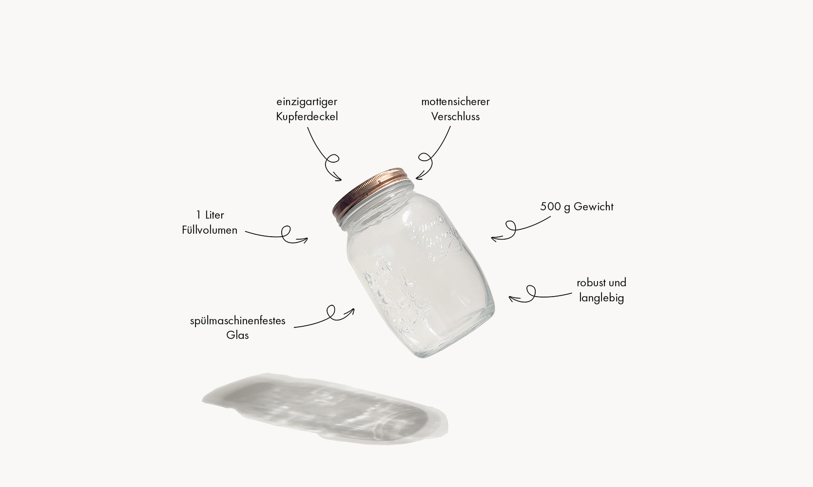 "Mit einem großzügigen Fassungsvermögen von 1 Liter bieten unsere Gläser ausreichend Platz für deine Lieblingslebensmittel, damit du stets gut vorbereitet bist und deine Küche organisiert bleibt. Es wirkt weder zu klein noch zu groß. Es ist die genau richtige Größe für einen maximal ästhetischen und praktischen Nutzen."