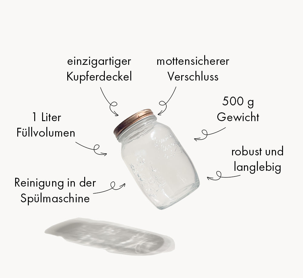 Ja, die Gläser werden mit einem einzigartigen und qualitativ hochwertigen Kupferdeckel zu dir geschickt, welche dein Glas absolut Dicht halten. So kannst damit Lebensmittel einmachen, einkochen oder diese einfach mottensicher aufbewahren.